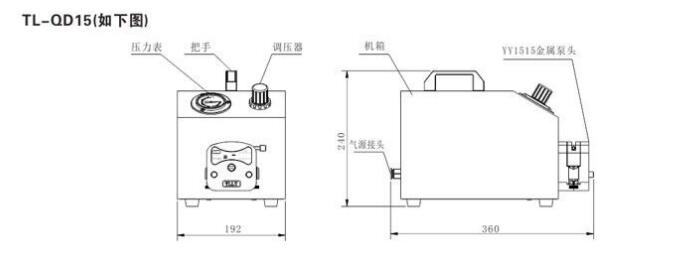 TL-QD15气动型蠕动泵概述:进气口输入洁净的压缩空气(0.4-0.6Mpa)泵开始工作,调节调压节气阀控制设备转速,适用于无电源、防爆防尘领域,如医药、食品、化工等,产品具有低噪声,低耗气量等优点。
