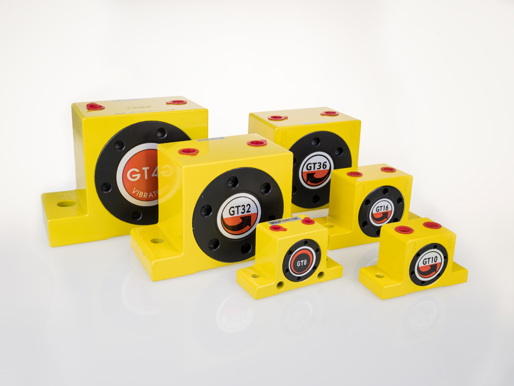 GT型轮式振动器概述:棘轮内装偏心铜合金配重,压缩空气喷入喷气孔冲击棘轮切口产生推力使棘轮旋转,棘轮运转时偏心偏重的离心力产生振动,因运转是由滚珠轴承支撑,噪音低。